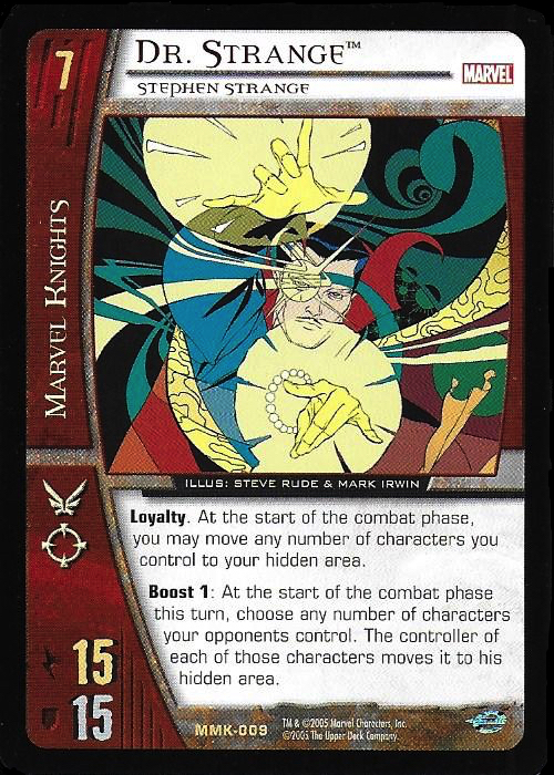 Number: MMK-009 Name: Dr. Strange 2nd Name: Stephen Strange Type: CCG Series: VS System Date: 2005 Artist: Steve Rude, Mark Irwin Manufacturer: The Upper Deck Company Other Characters: None Description: This is the Dr. Strange card for the VS card game. It outlines his states for this card game