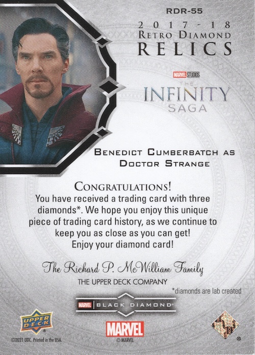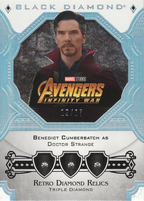 Number: RDR-55 Name: Benedict Cumberbatch as Doctor Strange 2nd Name: Retro Diamond Relics Type: Trading Card Series: Black Diamond Date: 2021 Artist: Live Action Manufacturer: Upper Deck Other Characters: No Description: This is Upper Deck's first treatment of Marvel cards with the Black Diamond brand. It is based on live action images with many chases and parallels. This card is from the Retro Diamond Relics chase set. It is numbered 12 of 17 and features Doctor Strange from the Avengers Infinity War Movie.