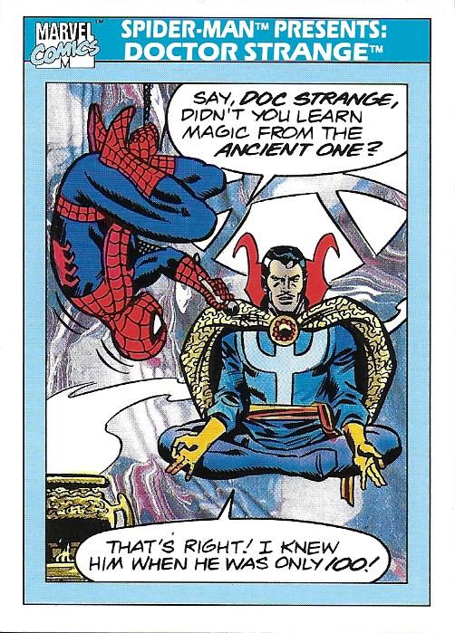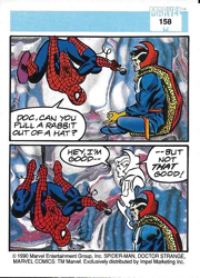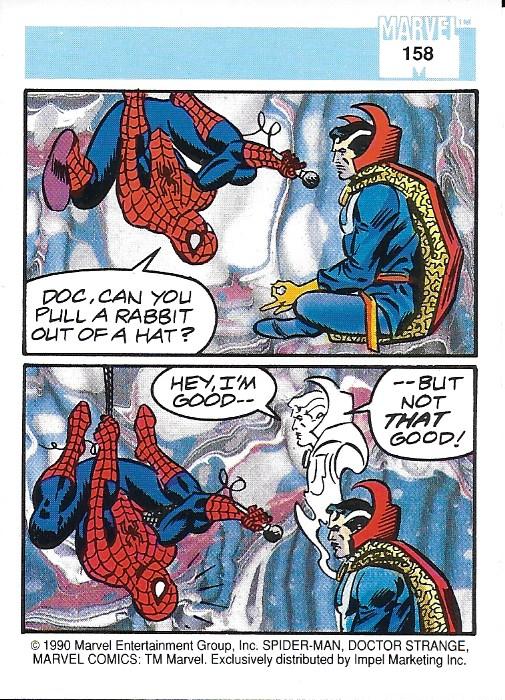 Number: 158 Name: Spider-man Presents: Doctor Strange 2nd Name: None Type: Trading Card Series: Marvel Universe Series 1 Date: 1990 Artist: Unk Manufacturer: Impel Marketing Inc Other Characters: Spider-man Description: This is a Series 1 Marvel Universe card featuring Dr. Strange and Spiderman