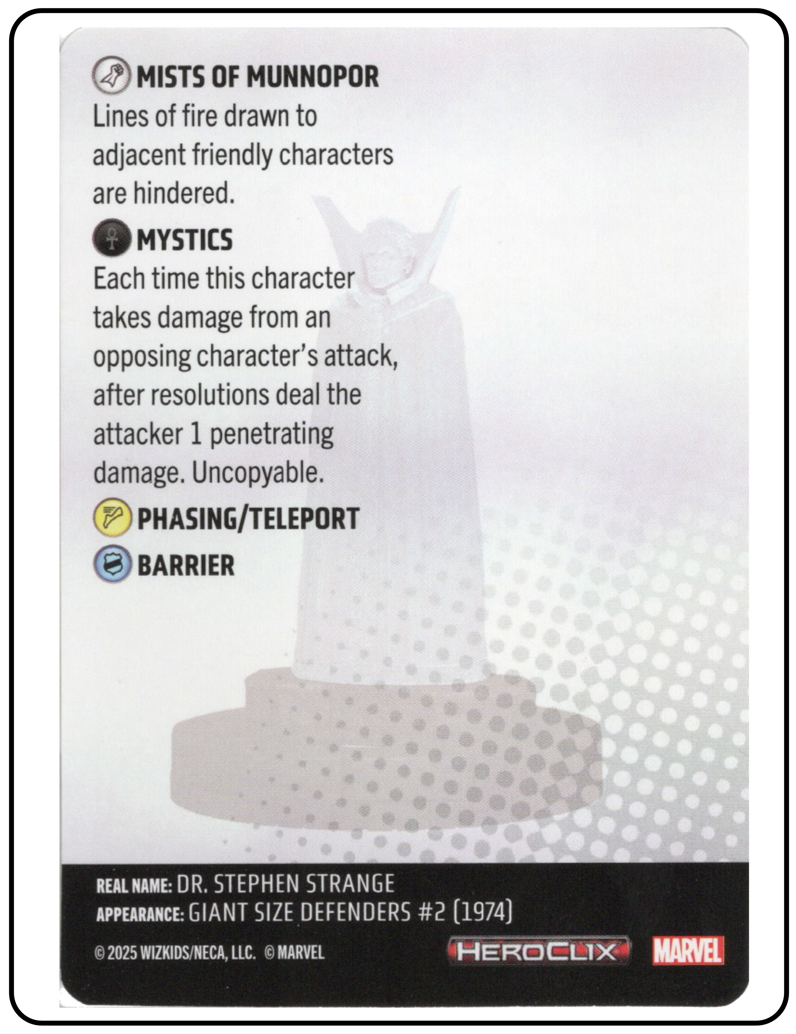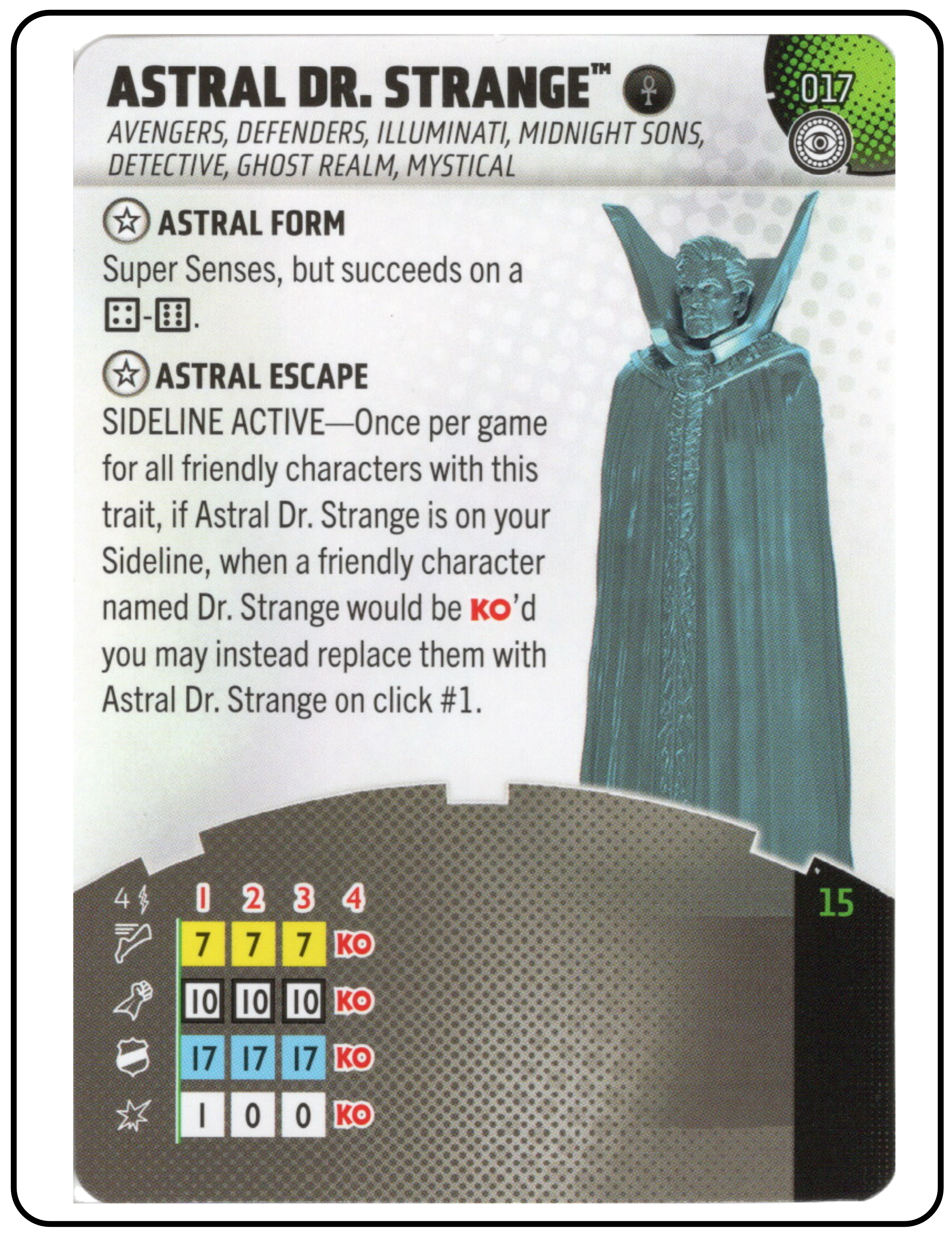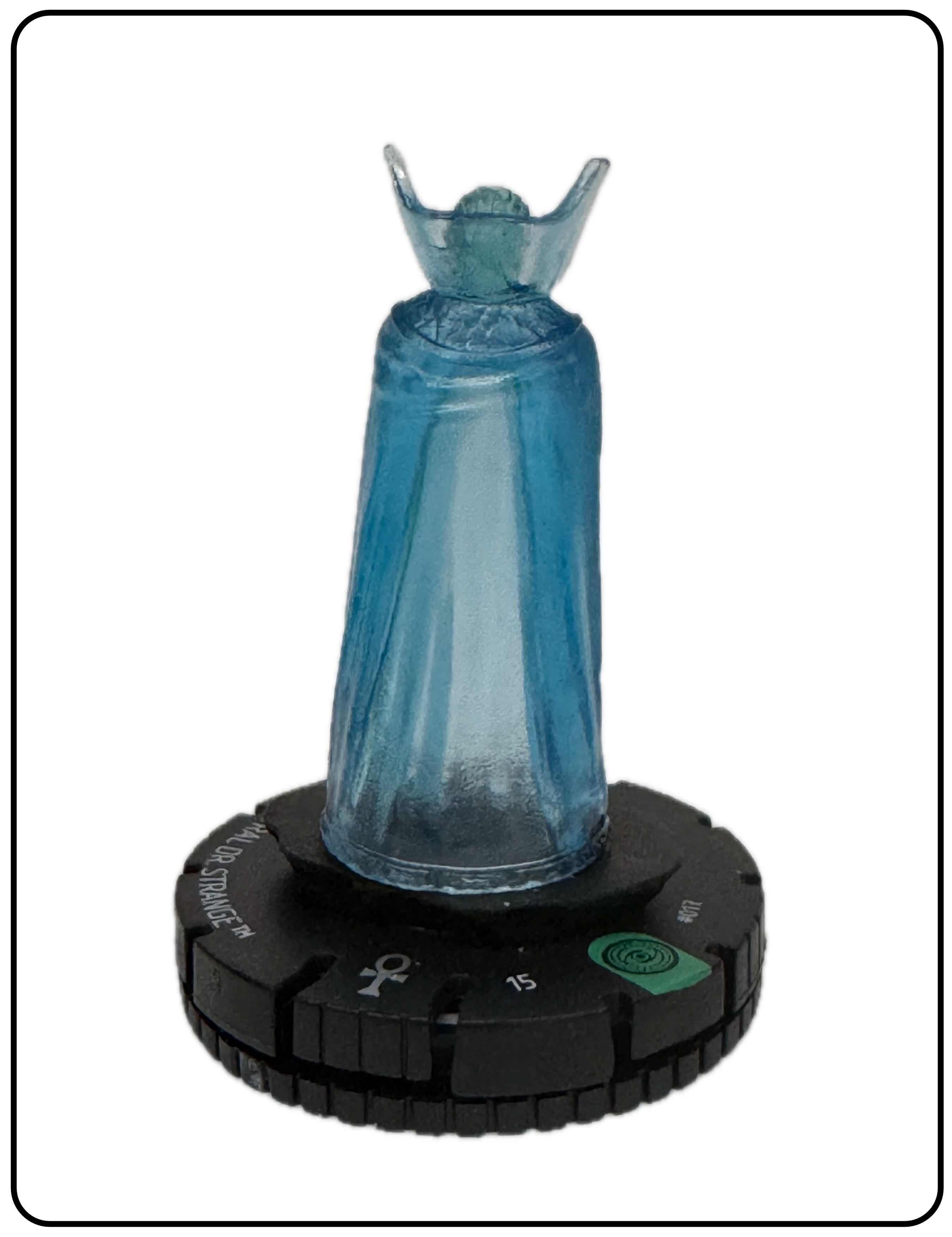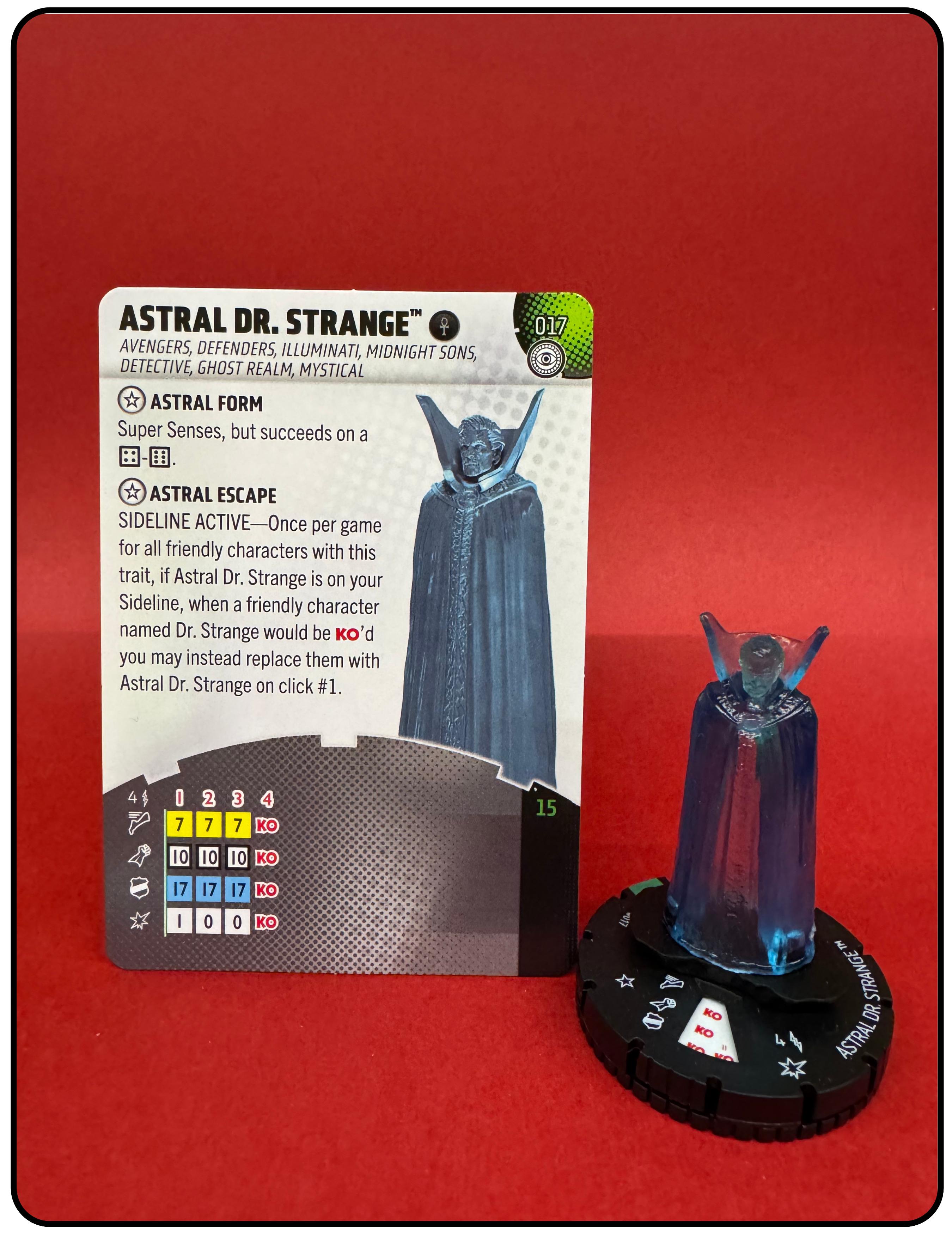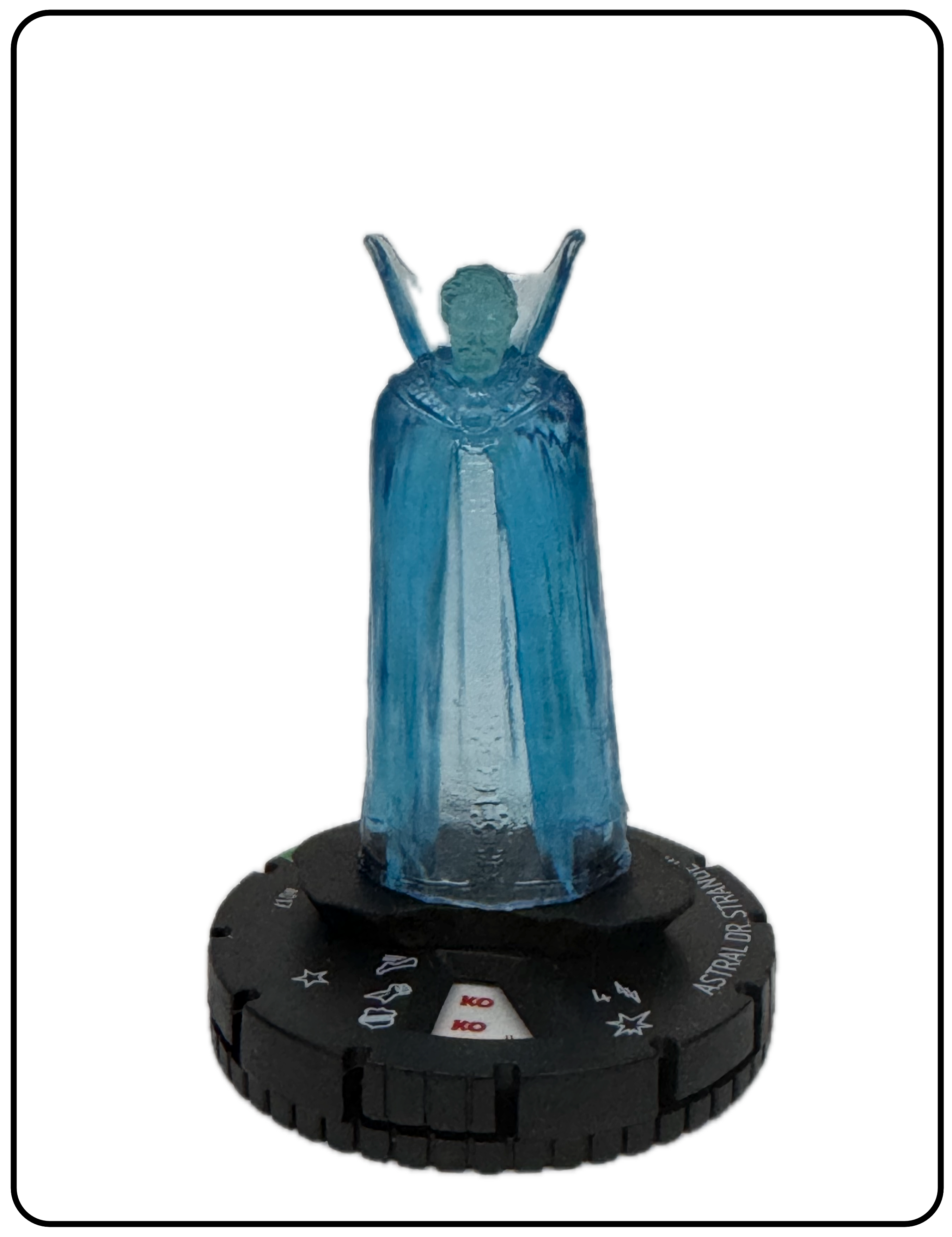 Name: Astral Dr. Strange Number: 017 Rarity: Uncommon Set Name: Strange Tales Type: Figure and Character Card Year: 2025 Catalog Number: 07:02:00:0006:K10 Main Category: Games Sub Category: HeroClix Secondary Category: None Details: This figure is the same sculpt of figure 001 and 100 except it is cast in a translucent blue to mimic Dr. Strange’s astral form. The figure is on a black raised base. This figure also has different stats on the Character Card than the other two.