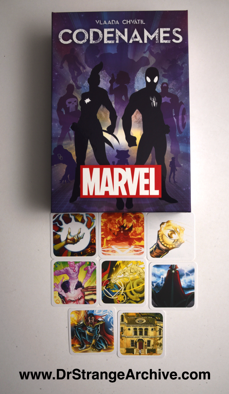 |  | Item: Vlaada Chvatil Codenames Date: 2017 Type: Card Game Size: 6 3/16" x 9 3/16" Company: USAopoly Description: This is a card game where S.H.I.E.L.D. agents and Hydra agents compete to identify all of their team's asset cards displayed on a secret grid. Dr. Strange is referenced on 8 cards: Levitation, Magic, Doctor Strange, Sanctum Sanctorum, Astral Projection, Eye of Agamotto, Conjure and Energy. Each card measures 2 1/2" x 2 1/2". |