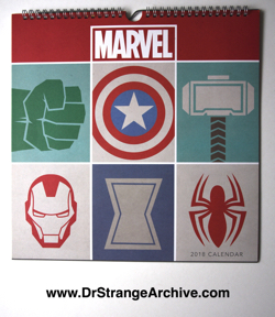 Item: Marvel 2018 Calendar Date: 2017 Type: Calendar Size: 12" x 12" Company: ACCO Brands Description: This is a 2018 Marvel calendar that came out the end of 2017. Dr. Strange is the month of December.