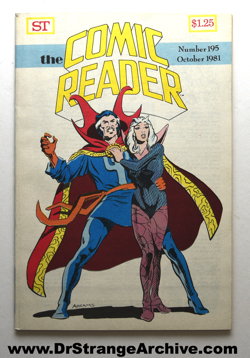 Item: Comic Reader 195 Date: 1981 Type: Magazine Size: 7 x 10 1/4 Company: Street Enterprises Description: This is a comic book collecting magazine that is 62 pages long and has a pieces of Dr. Strange art with Clea by Paul Abrams who was a comic artist, inker and penciler. It is issue 196 from October of 1981.