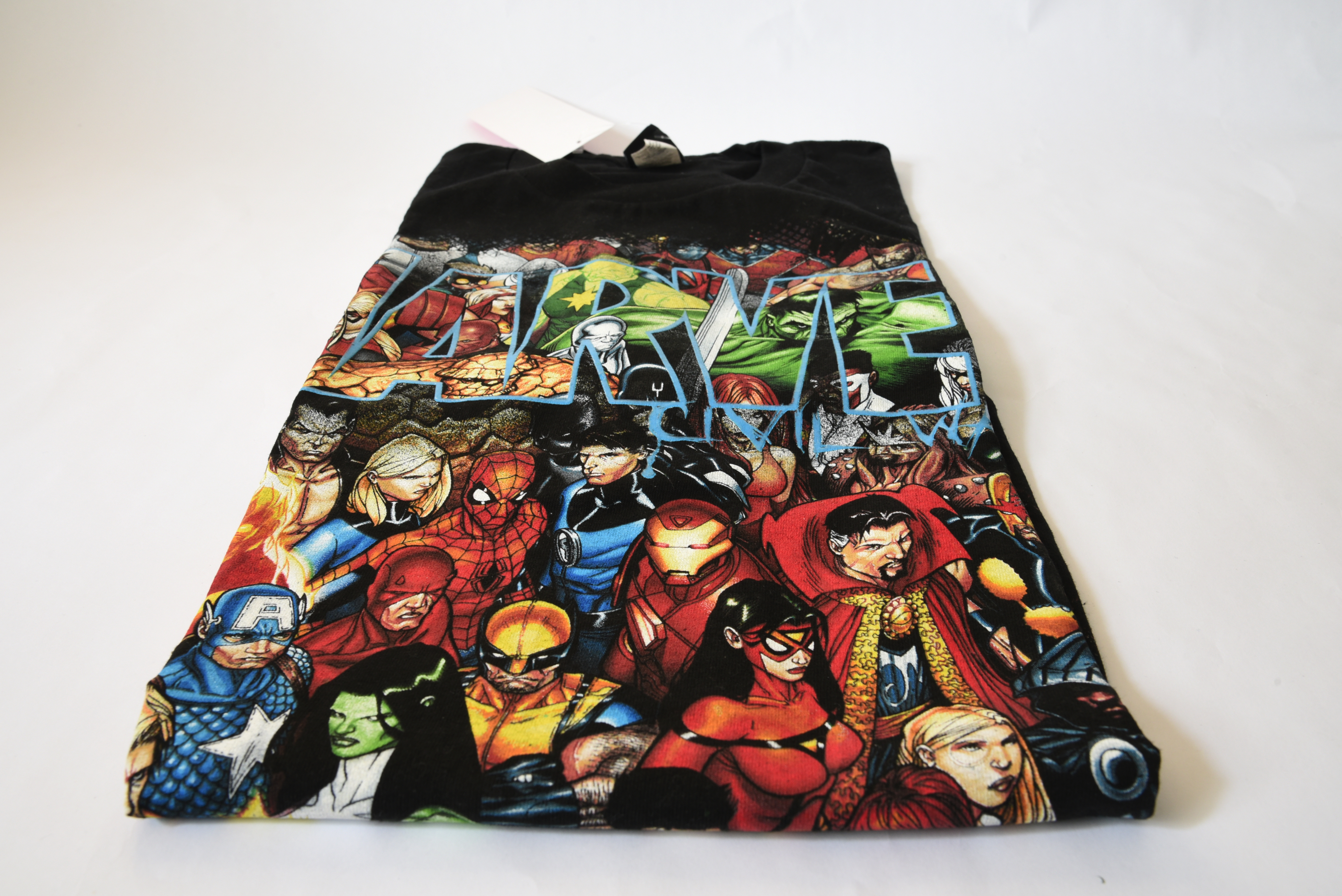 Item: Marvel Civil War T-Shirt Date: 2008 Type: Apparel Size: N/A Company: Mad Engine Description: This is a Marvel Civil War t-shirt with numerous characters on the front. Doctor Strange is just right of center.