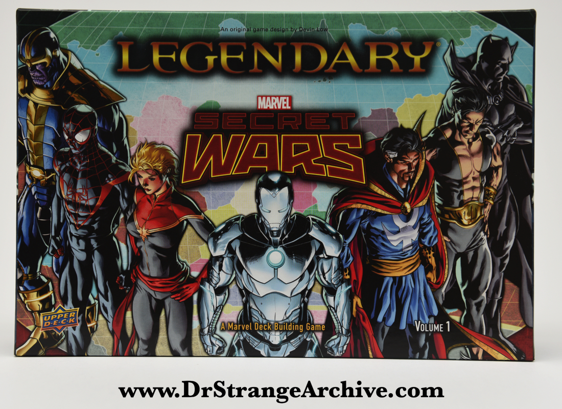 Item: Legendary Marvel Secret Wars Date: 2015 Type: Deck Building Game Size: 7 7/8" x 11.5" Company: Upper Deck Description: This is an Upper Deck Legendary deck building box game for Secret Wars. Dr. Strange is pictured on the front of the box. The Dr. Strange related cards can be viewed in the Cards Database.