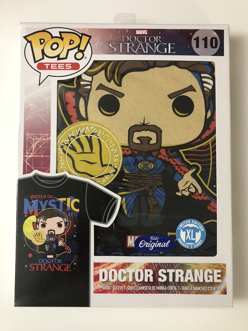 Item: Doctor Strange PoP T-Shirt Date: 2016 Type: Clothing Size: XL Company: Funko LLC Description: This is a limited edition XL unisex t-shirt featuring the movie version of Dr. Strange as a Funko Pop character with the words Master of the Mystic Arts Marvel Doctor Strange on the front. It is in a t-shirt box that mimics a Pop box with the number 110 in the corner.
