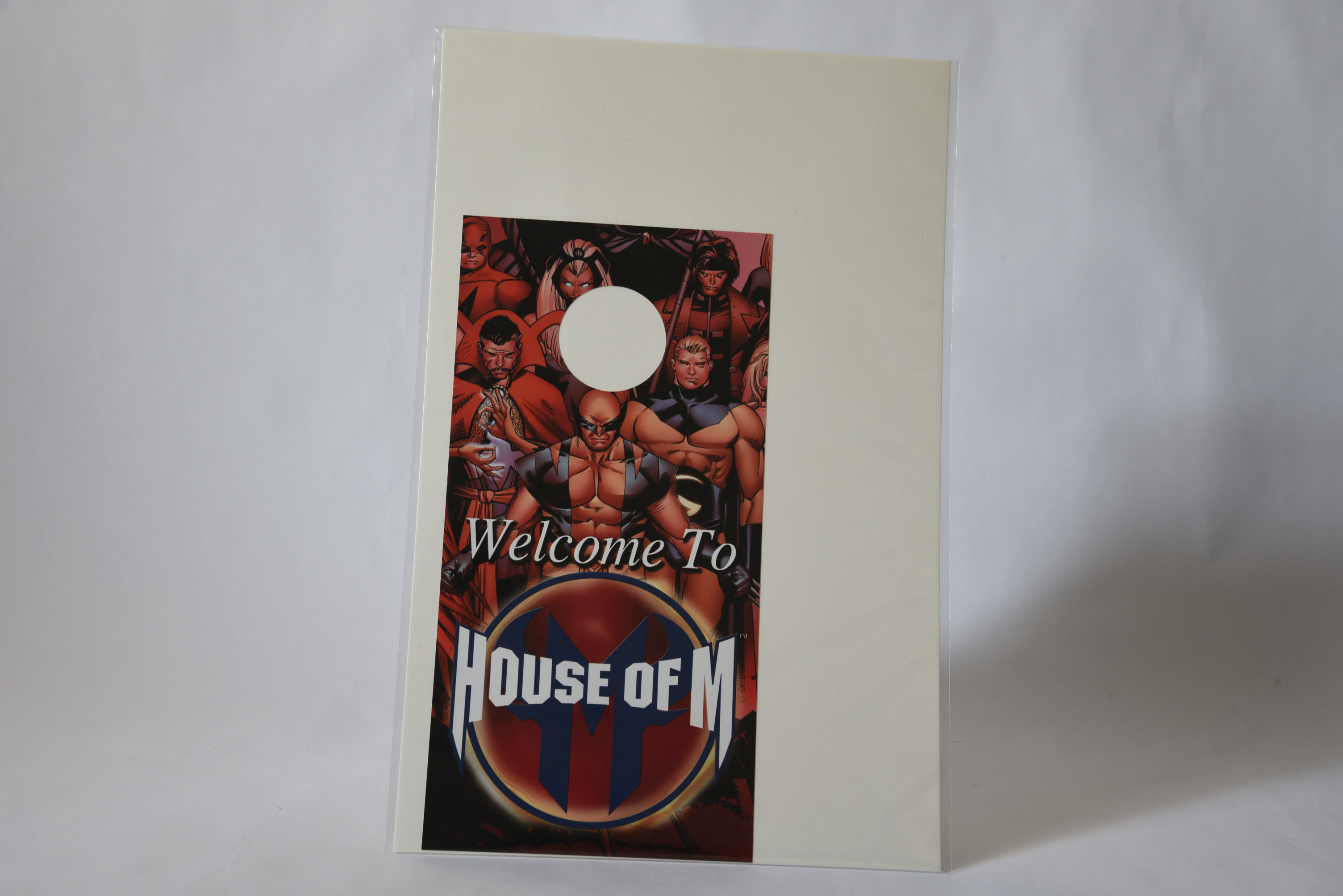 Item: House of M Checklist Door Hanger Date: 2005 Type: Misc Size: 8 x 4 Company: Marvel Characters, Inc. Description: This is a House of M event checklist door hanger that lists the various comics in the crossover on the back. Dr. Strange is featured on the front.