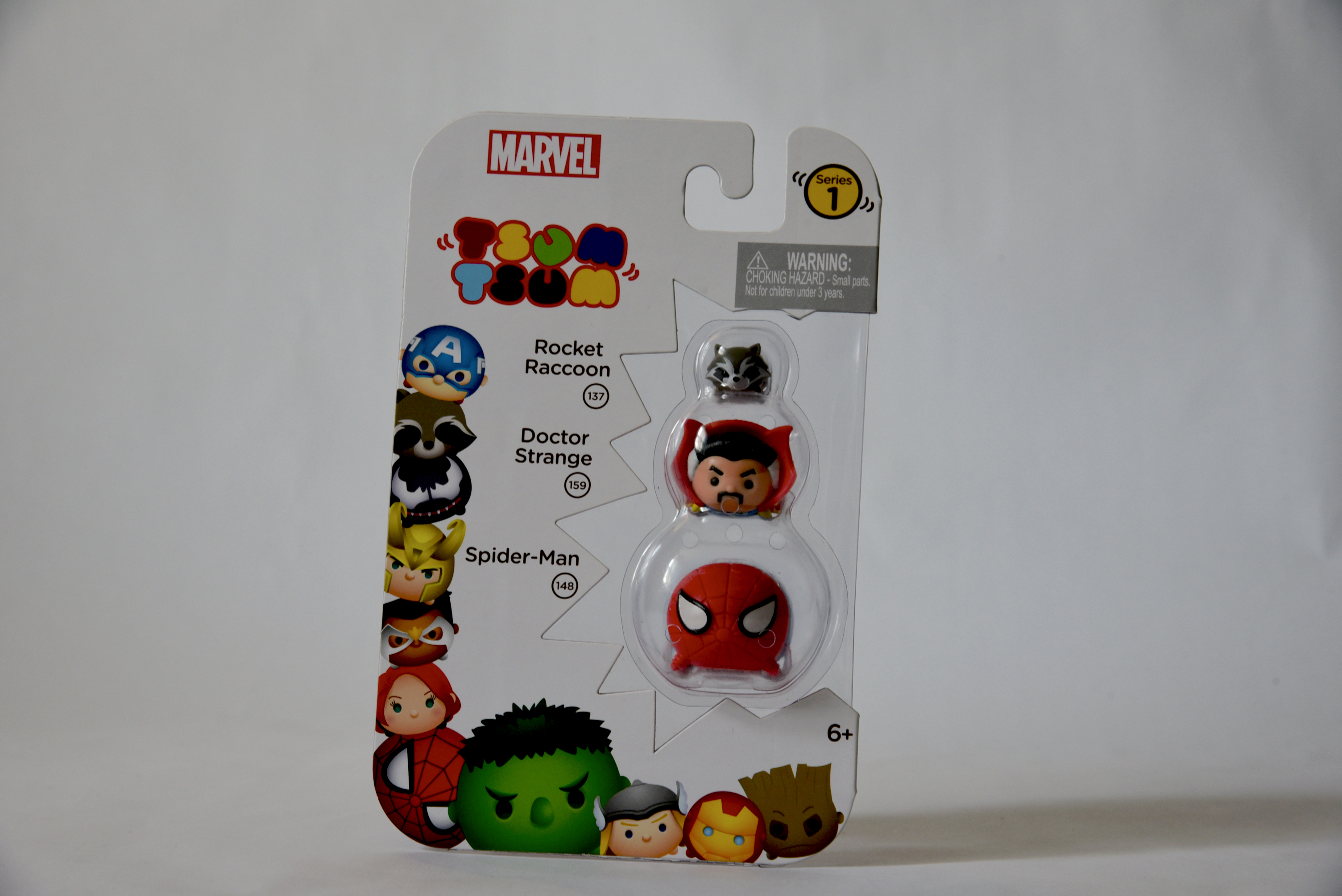 Item: Marvel Tsum Tsum Date: 2016 Type: Toy Size: 7 x 4 3/8 Company: Jakks Pacific, Inc. Description: This is a Tsum Tsum toy pack with Doctor Strange, Rocket Raccoon and Spider-man. This pack is labeled Series 1.