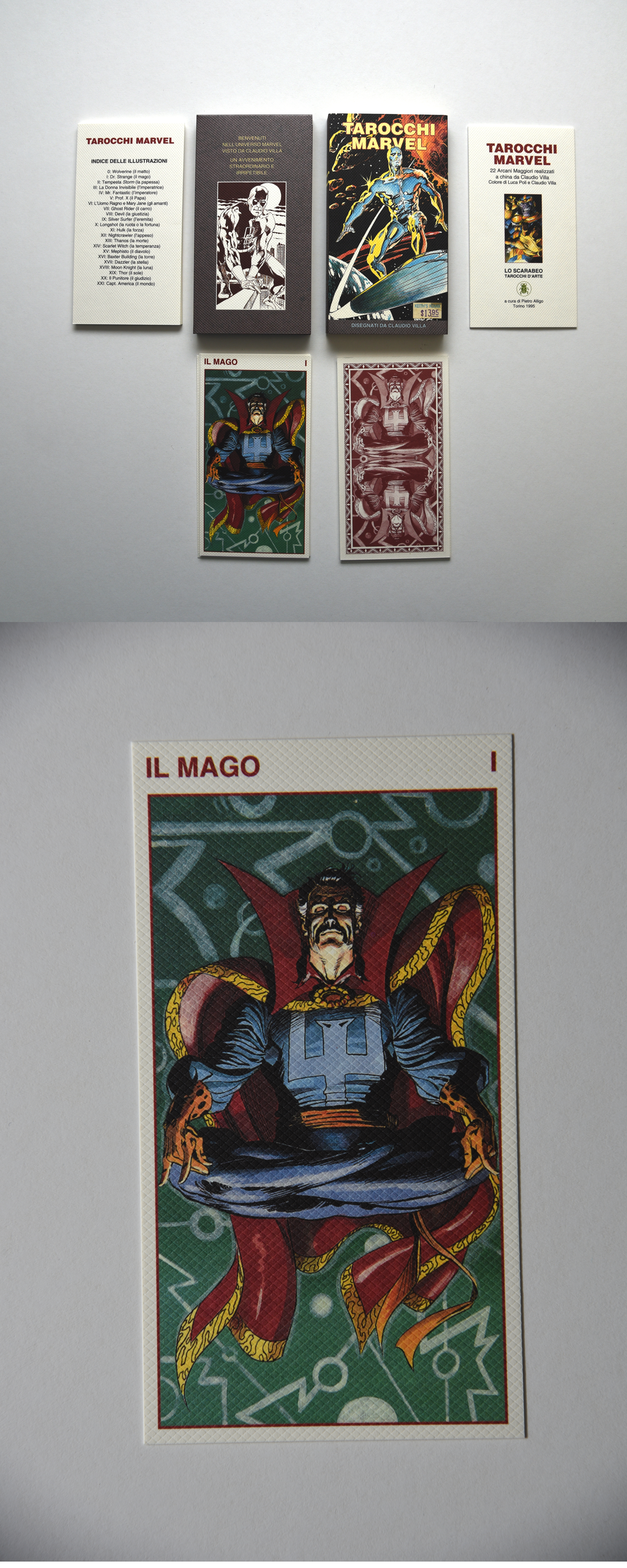 Item: Marvel Tarot Cards Date: 1995 Type: Cards Size: Company: Unk Description: This is a set of tarot cards made in Toreno Italy in 1995. Each card features a marvel character. Doctor Strange is the magician card and also appears on the back of all the other cards. This is one of my favorite Dr. Strange items. The art is great.