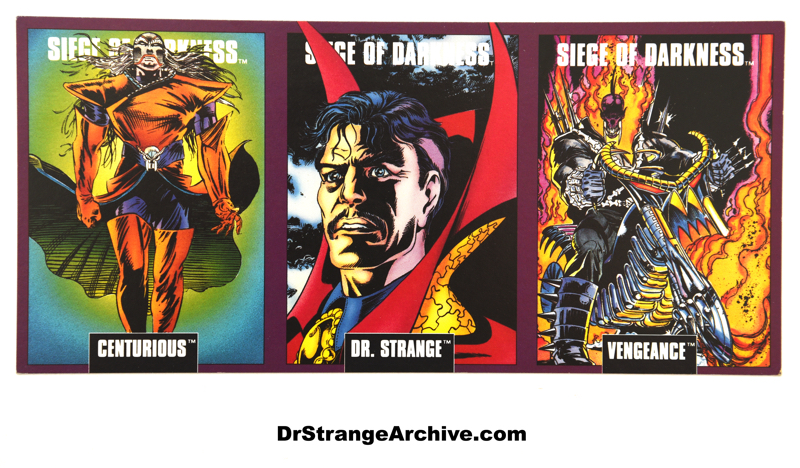 Item: Siege of Darkness Date: 1993 Type: Advertising Size: 7 1/2" x 3 1/2" Company: Marvel Entertainment Group Description: This is an uncut three trading card sheet advertising for the Siege of Darkness story cross over event. This crossover involved many of the Midnight Sons titles. Centurious, Dr. Strange and Vengeance are featured on the front of the three cards. Information on each of the three characters are on the back of the card along with some information on the Caretaker.