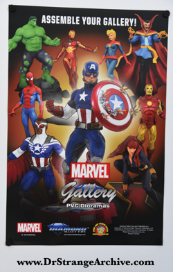 |  | Title: Marvel Gallery PVC Dioramas Artist: Unk Date: 2018 Type: Poster Size: 12 1/4" x 18 1/4" Other Characters: Captain Marvel, Iron Man, Black Widow, Spider-Man, Hulk, Falcon, Female Iron Man Manufacturer: Diamond Select Toys Description: This is a poster advertising Diamond Select Toys PVC Marvel statues. I picked this up at the Diamond booth at the 2018 C2E2. |