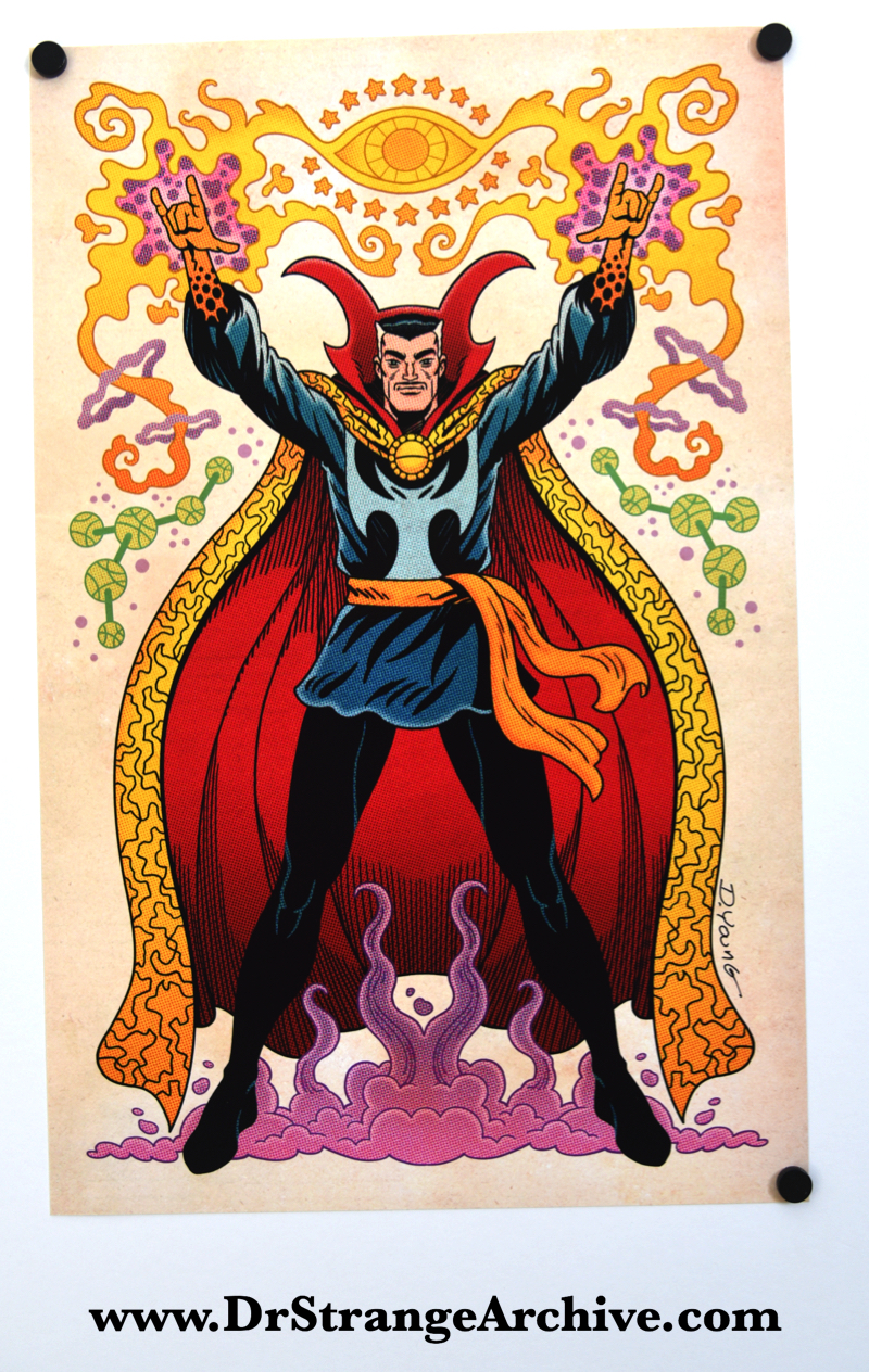 Title: None Artist: D. Young Date: Unk Type: Print Size: 11" x 17" Other Characters: None Manufacturer: None Description: This is a fantastic old school looking print of Dr. Strange. I picked it up at the 2018 C2E2 show. This artist has several other Dr. Strange related characters in the same old school format. I have this print in a key chain which is located in the Misc Collectables Database.