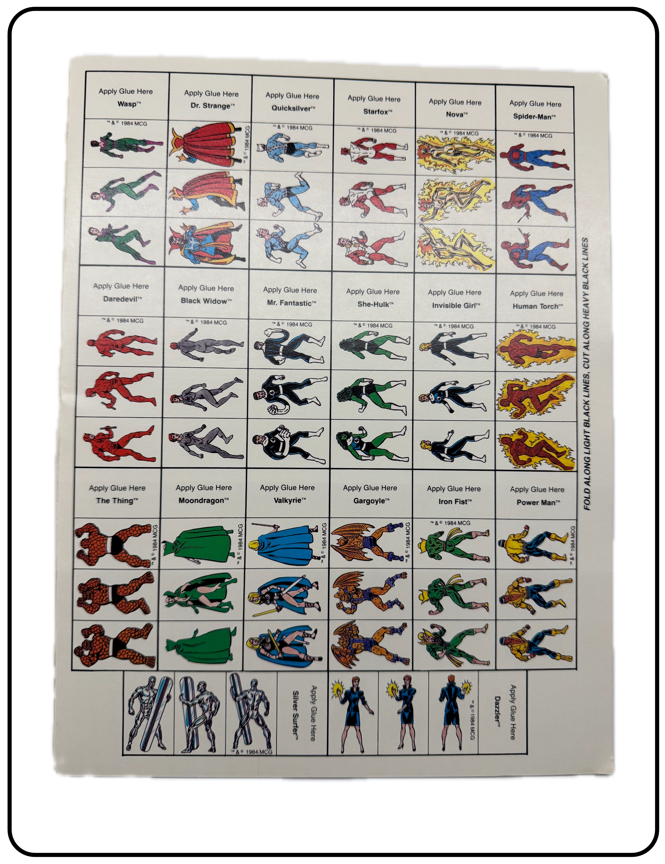 Name: Marvel Super Heroes Adventure Fold-up Figures Company: TSR, Inc. Type: Accessory / Figures Year: 1984 Catalog Number: 07:03:00:0006:C21 Main Category: Games Sub Category: Role-playing Games Secondary Category: None Details: This game accessory includes poster board thickness pages of Marvel characters that can be cut out and folded to create a stand-up figure to use on game maps. Eight pages of figures is included.