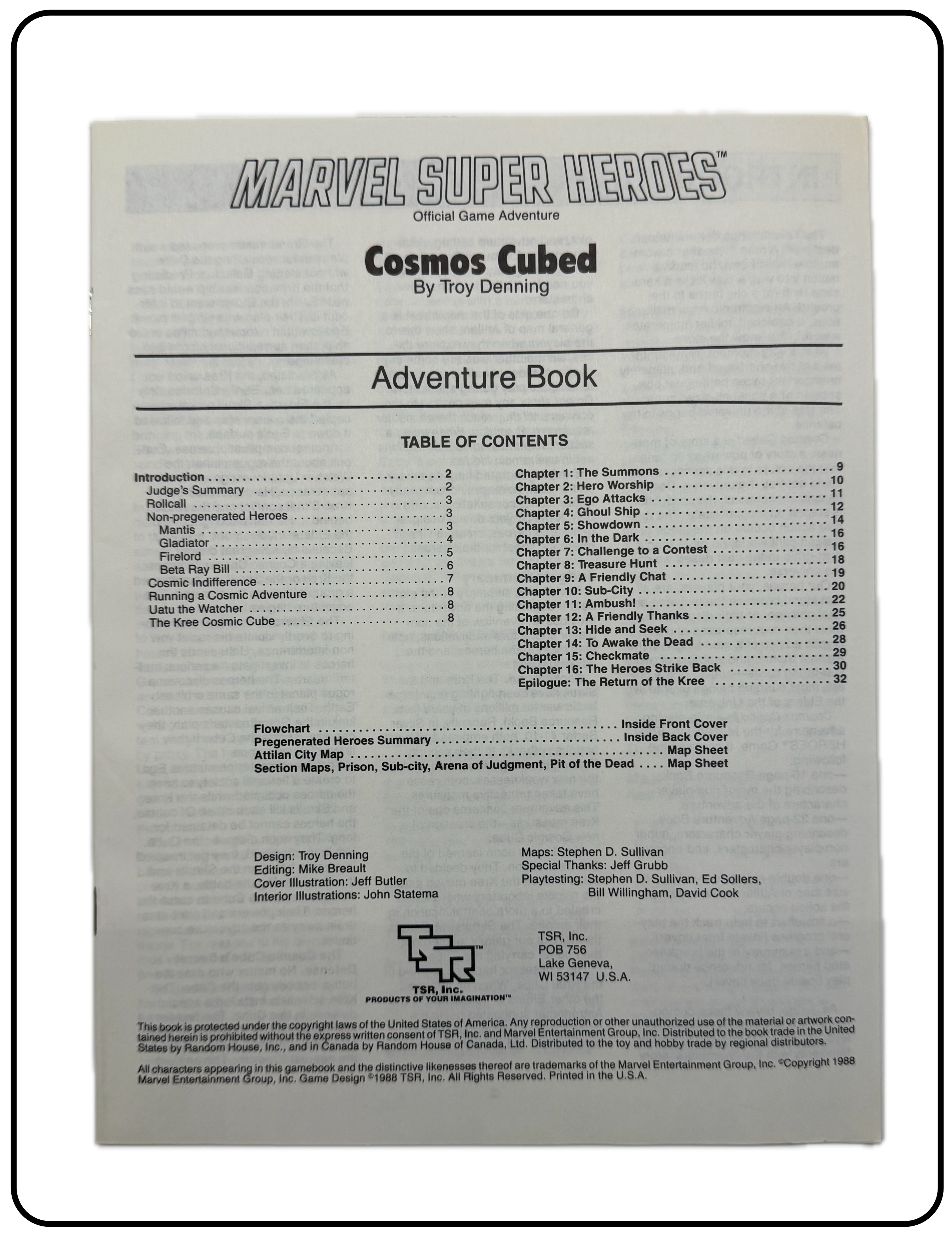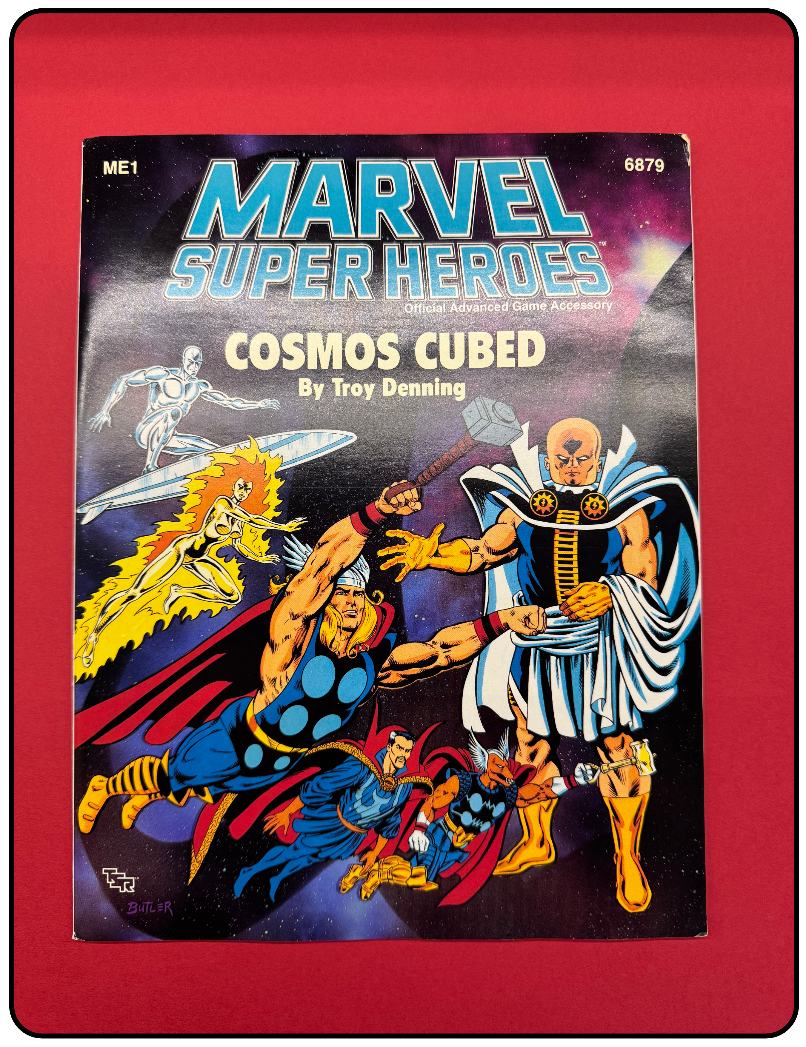 |  | Name: Marvel Super Heroes Cosmos Cubed Company: TSR, Inc. Type: Adventure / Advanced Accessory Year: 1988 Catalog Number: 07:03:00:0008:C21 Main Category: Games Sub Category: Role-playing Games Secondary Category: None Details: This is an adventure/module by Troy Denning for the Marvel Super Heroes role-play game. It is designed for cosmically powered super heroes like Dr. Strange, Thor, Silver Surfer, etc. The Watcher has assembled some of the most powerful super heroes and sent on a mission to a faraway planet where they discover a secret that threatens the very universe! It includes an Adventure Book, Resource Book and a large foldout section with several maps. |